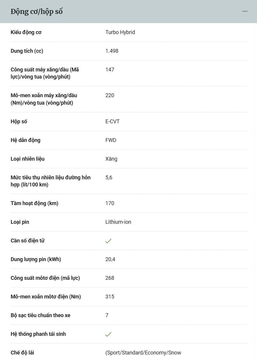 - Mức tiêu thụ năng lượng hỗn hợp: 14.2 kWh/ 100Km (NEDC)